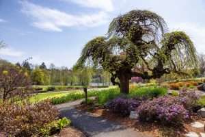 Path in a green vibrant garden with colorful flowers in a modern city park.