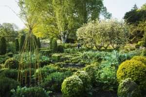 View of garden with flower beds, shrubs and trees in the background.,Barnsley House,England